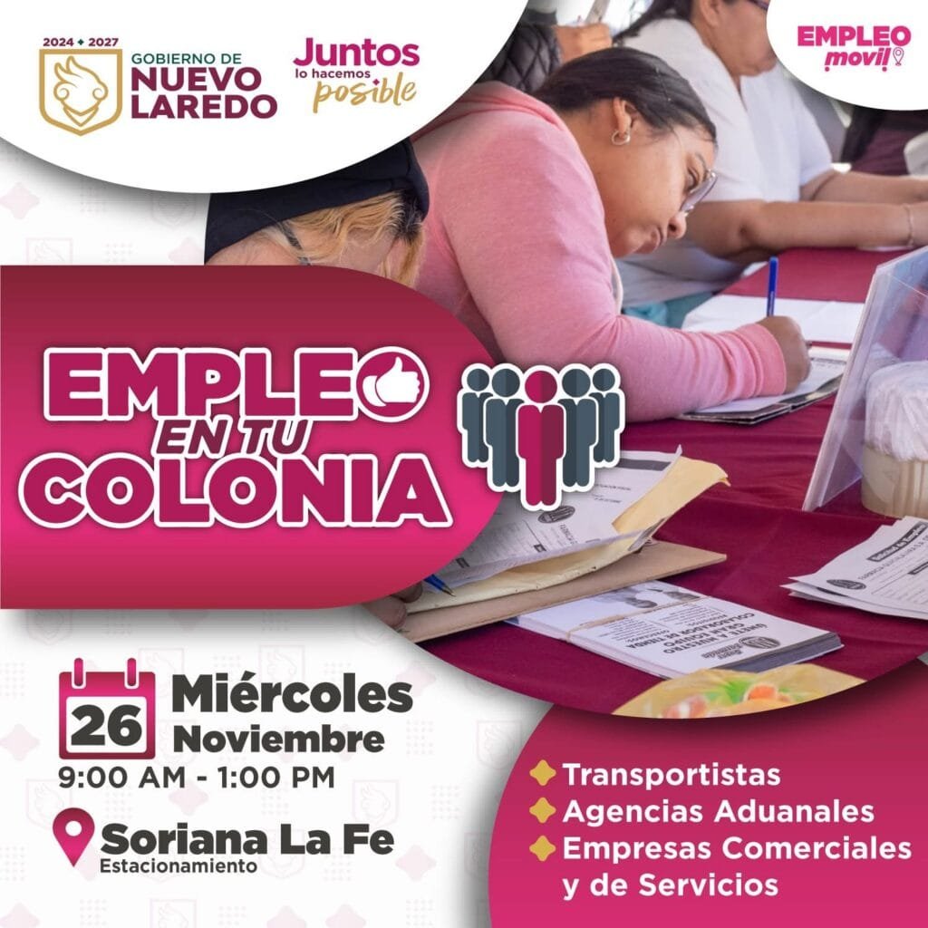 Si estás en busca de una oportunidad laboral, el Gobierno de Nuevo Laredo, a través de la Secretaría de Desarrollo Económico, te invita a una nueva edición del programa “Empleo en Tu Colonia”, que se llevará a cabo el miércoles 26 de noviembre.