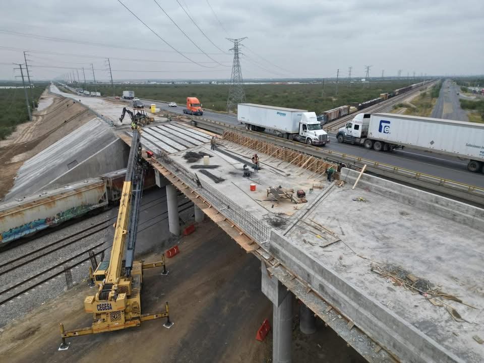 La construcción del Puente de la Carretera Mex II continúa avanzando de manera firme y coordinada. Luego del colado de dos de las tres losas principales, las cuadrillas trabajan ahora en la edificación de los muros que darán estructura y soporte a esta obra estratégica para Nuevo Laredo.