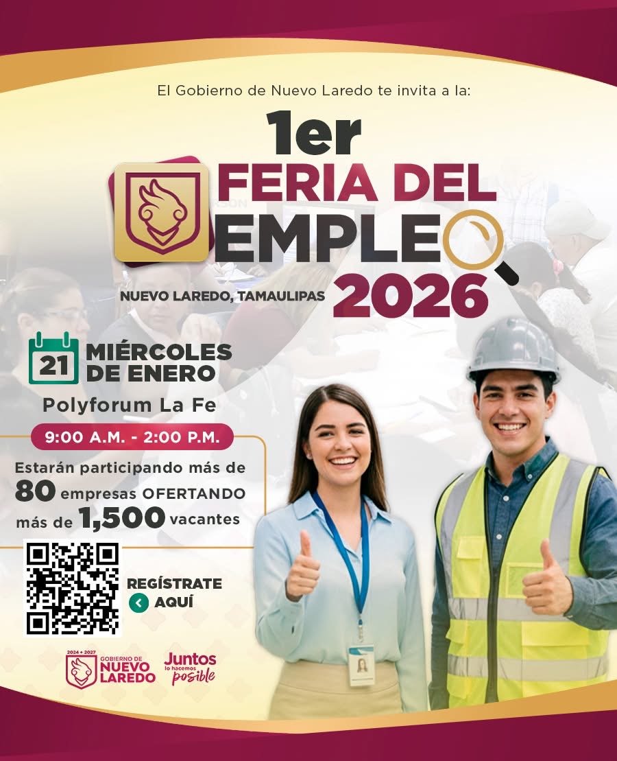 El Gobierno Municipal de Nuevo Laredo, a través de la Secretaría de Desarrollo Económico, realizará la primera Feria de Empleo 2026 el miércoles 21 de enero, a partir de las 9:00 de la mañana, en el Polyforum La Fe. El evento contará con la participación de más de 80 empresas y ofrecerá más de mil 500 vacantes en distintos sectores, acercando oportunidades laborales a la ciudadanía.