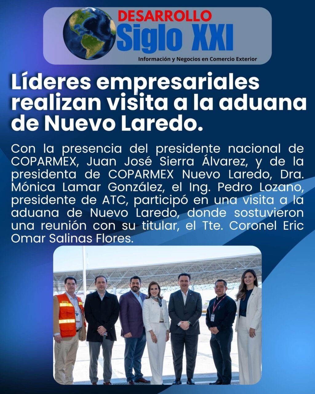 En un encuentro de diálogo y coordinación, el presidente nacional de COPARMEX, Juan José Sierra Álvarez, y la presidenta de COPARMEX Nuevo Laredo, Dra. Mónica Lamar González, realizaron una visita a las instalaciones de la Aduana de Nuevo Laredo, acompañados por el Ing. Pedro Lozano, presidente de ATC. Durante la jornada, sostuvieron una reunión de trabajo con el titular de la aduana, Tte. Coronel Eric Omar Salinas Flores, en la que se abordaron temas estratégicos relacionados con la operación aduanera y el fortalecimiento de la colaboración entre los sectores público y empresarial.